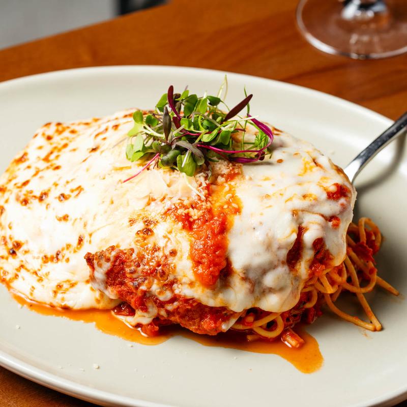 Chicken breast, lightly breaded in Italian seasoning with melted mozzarella and spaghetti pasta.